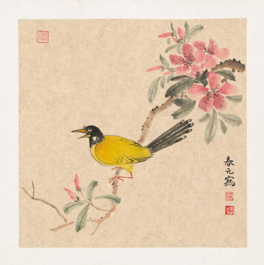 作品名称 蔡春元《粉花黄鸟》 作品编号 S47-100 作 者 蔡春元 作品规格 33*33 CM