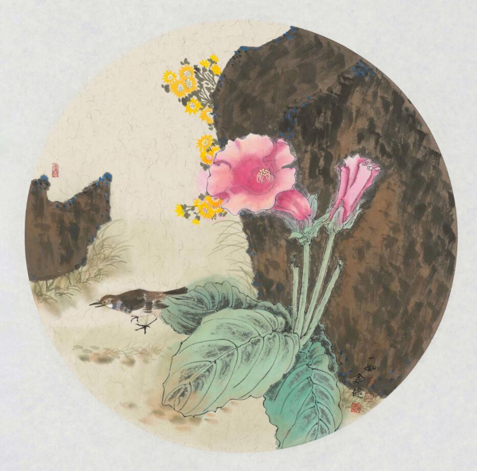 作品名称 王娜娜《绿叶粉花黄花小鸟》 作品编号 S44-122 作 者 王娜娜 作品规格 50*50 CM