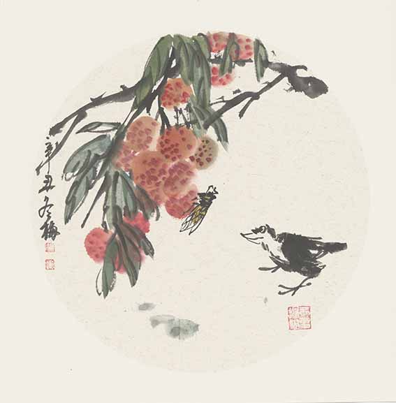 作品名称 《荔枝知了小鸟》 作品编号 S14-96 作 者 吴冬梅 作品规格 50*50 CM